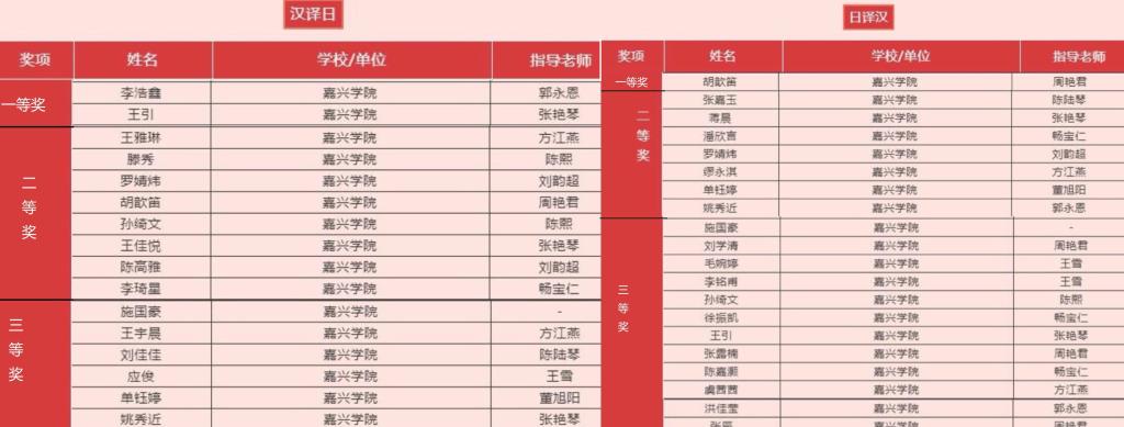 11月28日,“第四届人民中国杯日语国际翻译大赛”颁奖大会在广州隆重举办,我校日语专业李浩鑫、王引和胡歆笛三位同学分获汉译日和日译汉一等大奖,滕秀、罗婧炜、张嘉玉和蒋晨等15位同学将二等奖收入囊中,王宇晨、刘佳佳、毛婉婷和刘学清等18位同学喜获三等奖。