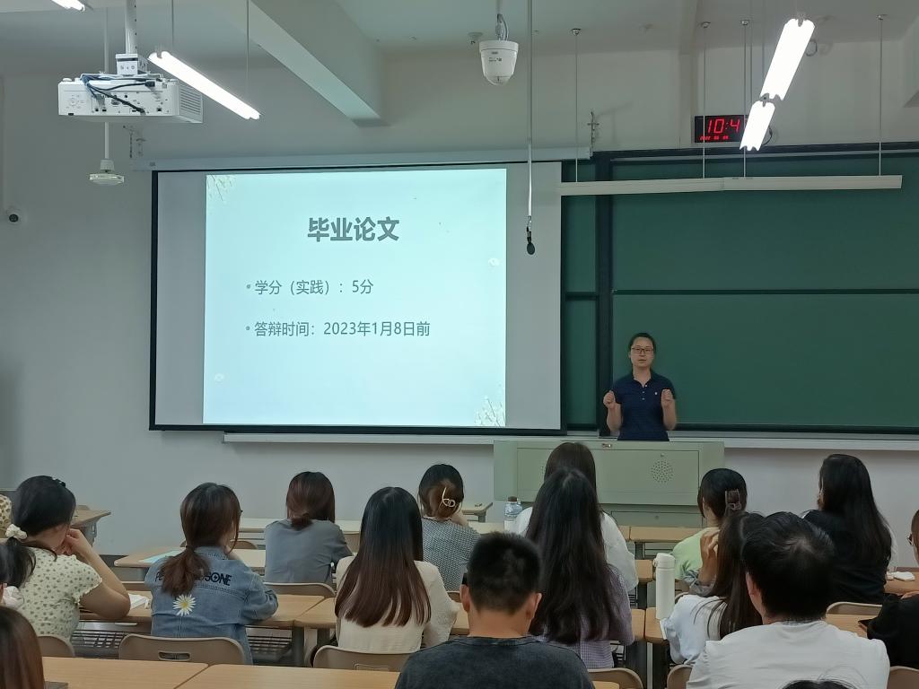 接下来,系主任刘韵超对于毕业论文撰写的基本要求进行了较为细致的说明。她说,发现问题并运用学术方法独自解决问题是论文的目标,解决的问题应该与日语专业知识相关,论文实际拷问的是同学们的理性思维、阅读文献和数据分析能力。她还就文献综述、开题报告和论文完成的时间节点做了布置。