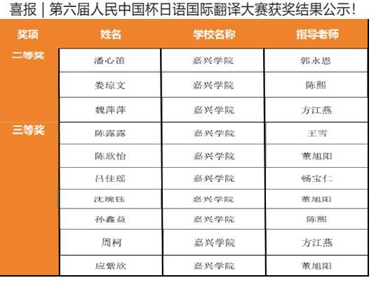 2023年举办的“第六届人民中国杯日语国际翻译大赛”成绩于近日揭晓,我校日语专业潘心笛、娄琼文、魏萍萍3名同学斩获二等奖,陈露露、周柯、吕佳瑶、孙鑫益、陈欣怡、沈琬钰、应紫欣7名同学喜获三等奖。