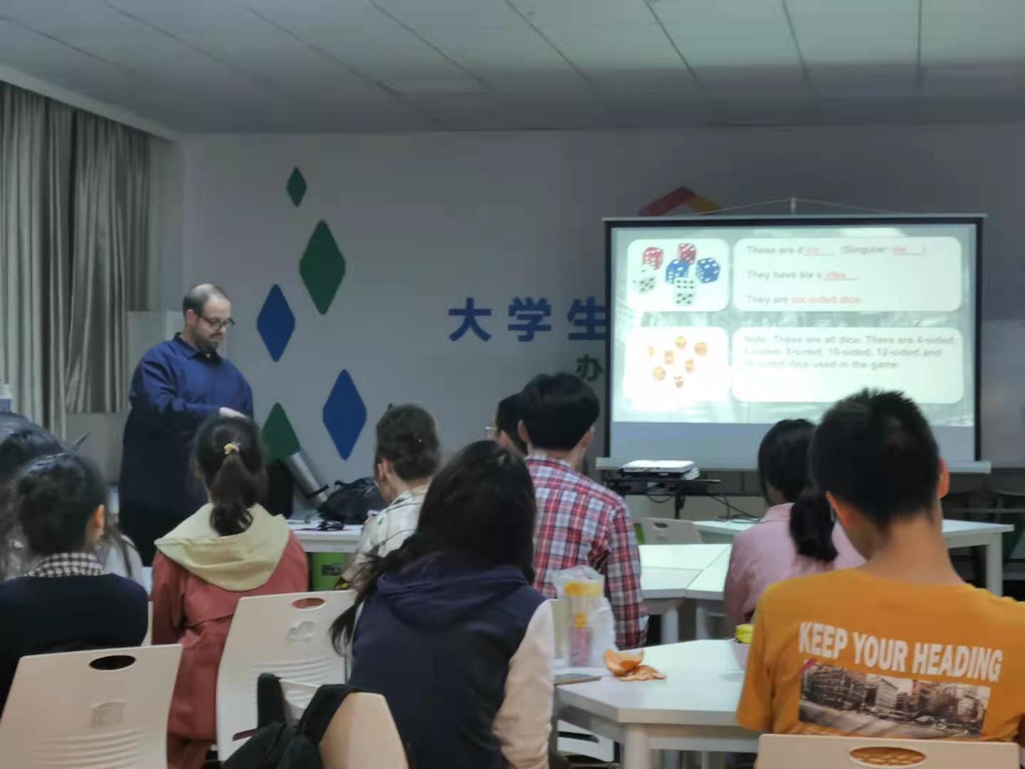 4月22日晚18:30,由外国语学院主办的本学期第二次外教沙龙活动于北区创业园一楼展厅顺利开展。本次活动主题为“Dungeons & Dragons:the history,the culture ,and the experience of the world's most famous table-top role playing game(龙与地下城:世界上最著名桌面角色扮演游戏的前世今生)”。以游戏这一大家感兴趣的话题入手,同学们在潜移默化中锻炼了英语口语,增长了西方文化知识。