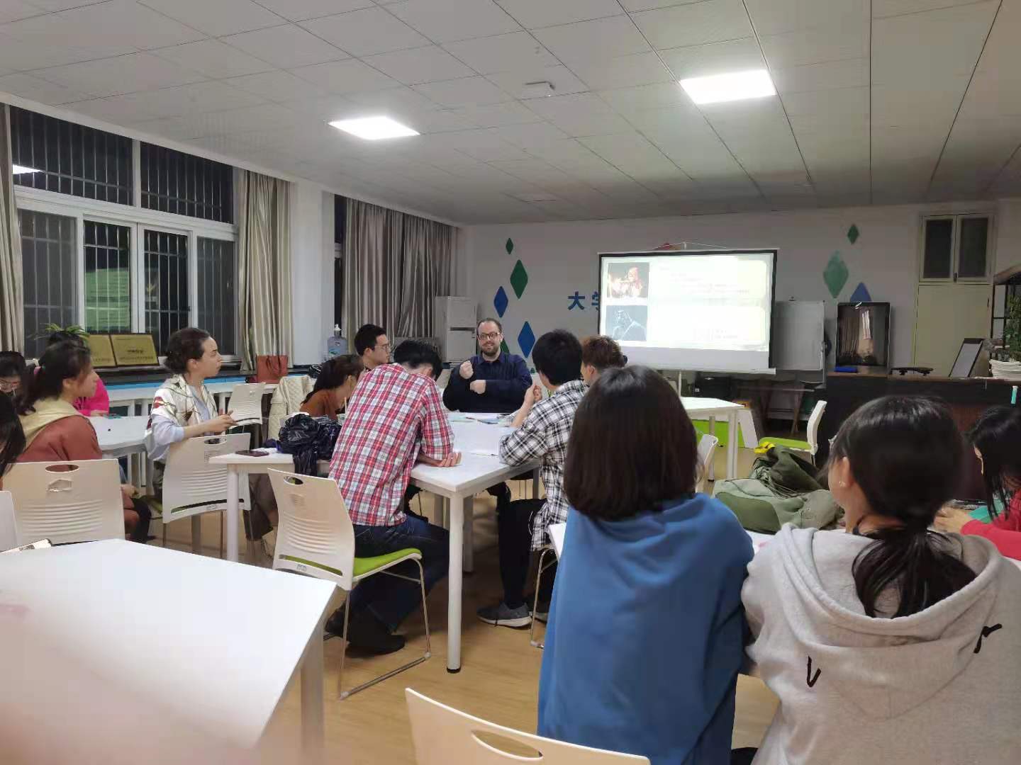 本次外教沙龙由外教Nathan Tomey担任主讲,外教Kseniia Tsytsiura也参与到了活动中。Tomey老师的语言幽默风趣,赢得了无数掌声,在活动伊始便紧紧抓住同学们的注意力。他以益智桌游在西方社会中的历史及文化切入,用新颖的教学手段提炼并讲解了其中主要的英语词汇,平时枯燥的词汇学习碰撞上有趣生动的益智游戏,瞬间便擦出了火花,同学们纷纷表示,如此才是寓教于乐,最头痛的单词学习竟是可以如此的轻松有趣。