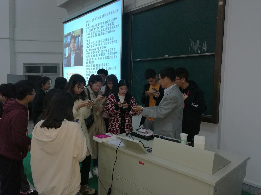 负笈东瀛写春秋!回眸段先生在日的奋斗历程,堪为我院学子之楷模,“后生可畏,处处留心皆学问,在年轻的人生字典里没有‘困难’二字”,段先生的激励让我们的学子热血澎湃,激情高昂。段先生用“一夜情”的风趣比喻表达对我院学子的喜爱,学生们也用“一见钟情”的比喻表达了对段先生的敬爱。互动环节中,同学们踊跃提问,虚心求教,段先生不厌其烦,悉心指导。浓浓的夜色中,师生交流高潮迭起。