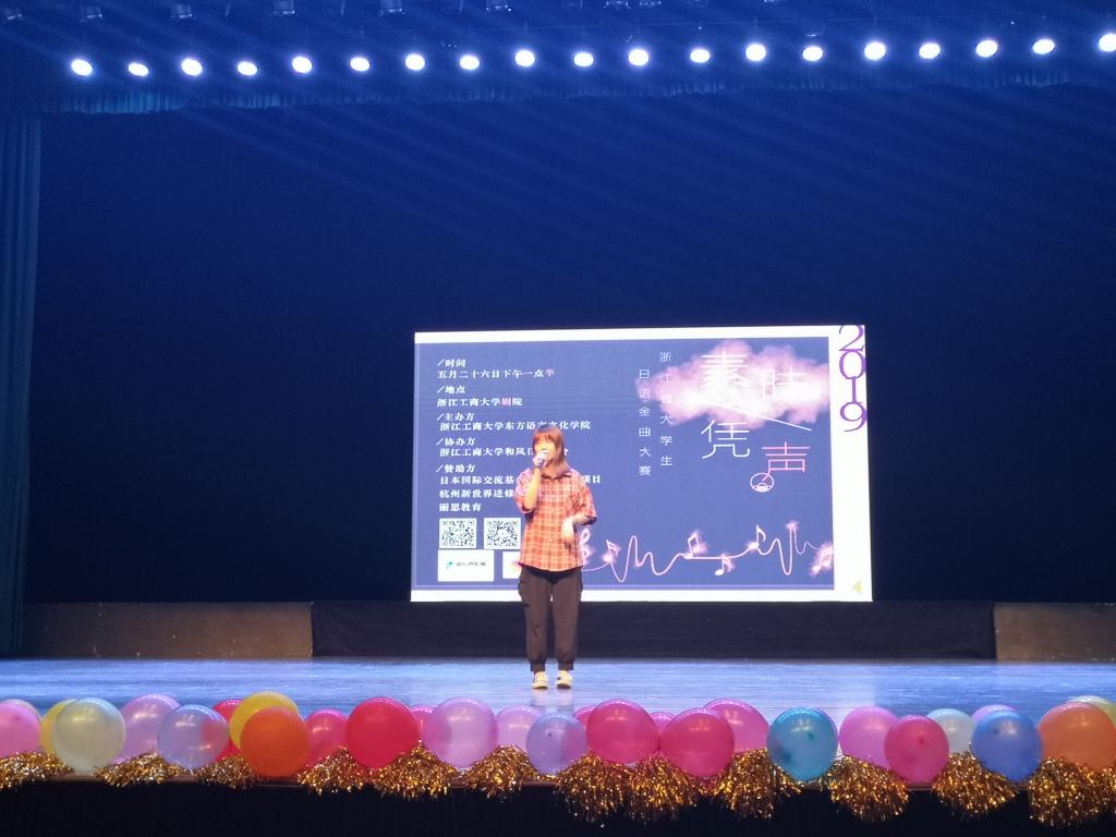 5月26日下午,第八届浙江省大学生日语金曲大赛在浙江工商大学举行。来自浙江大学、浙江工商大学、浙江师范大学等14所高校的15组选手参加了比赛,我院日语系172班唐怡清同学代表我校参赛。