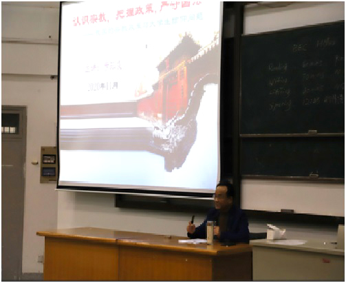 为进一步指导新生全面系统地了解宗教知识,树立正确的宗教观念,外国语学院于2020年11月25日晚在外语楼310开展了新生宗教政策宣讲讲座。本次讲座邀请了文法学院副院长步珏良副教授主讲,外国语学院20级全体新生参加了讲座。