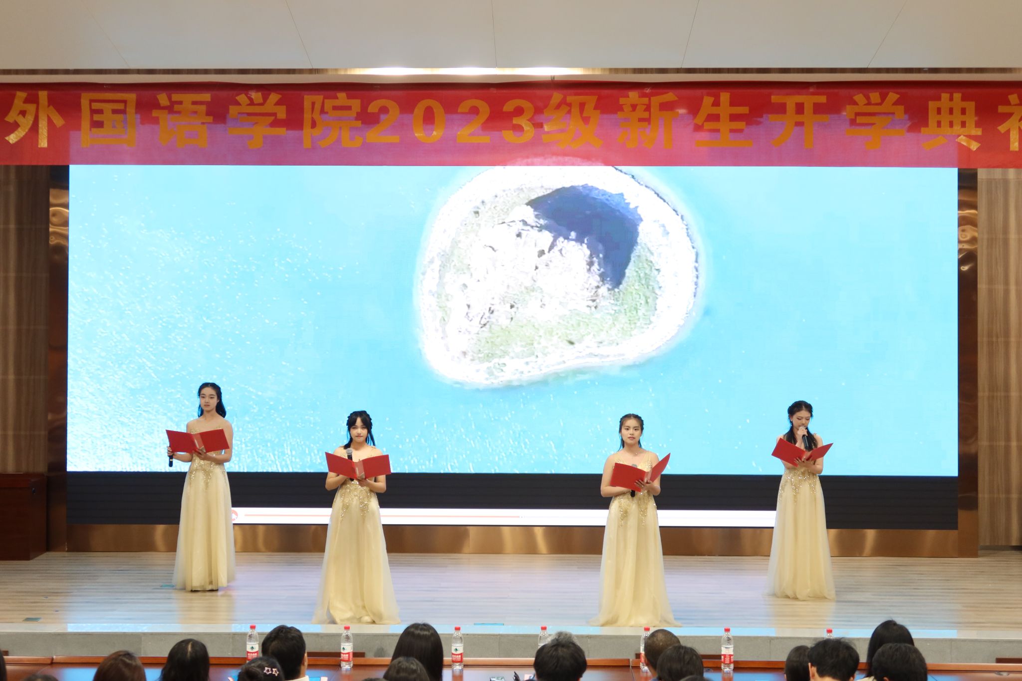外国语学院2023级新生开学典礼于9月10日在图书馆一楼报告厅举行。外国语学院党政领导班子、系主任、全体辅导员、新生班班主任、新生班班助以及2023级全体新生参加了本次典礼。典礼由团委老师吴琳轩主持。