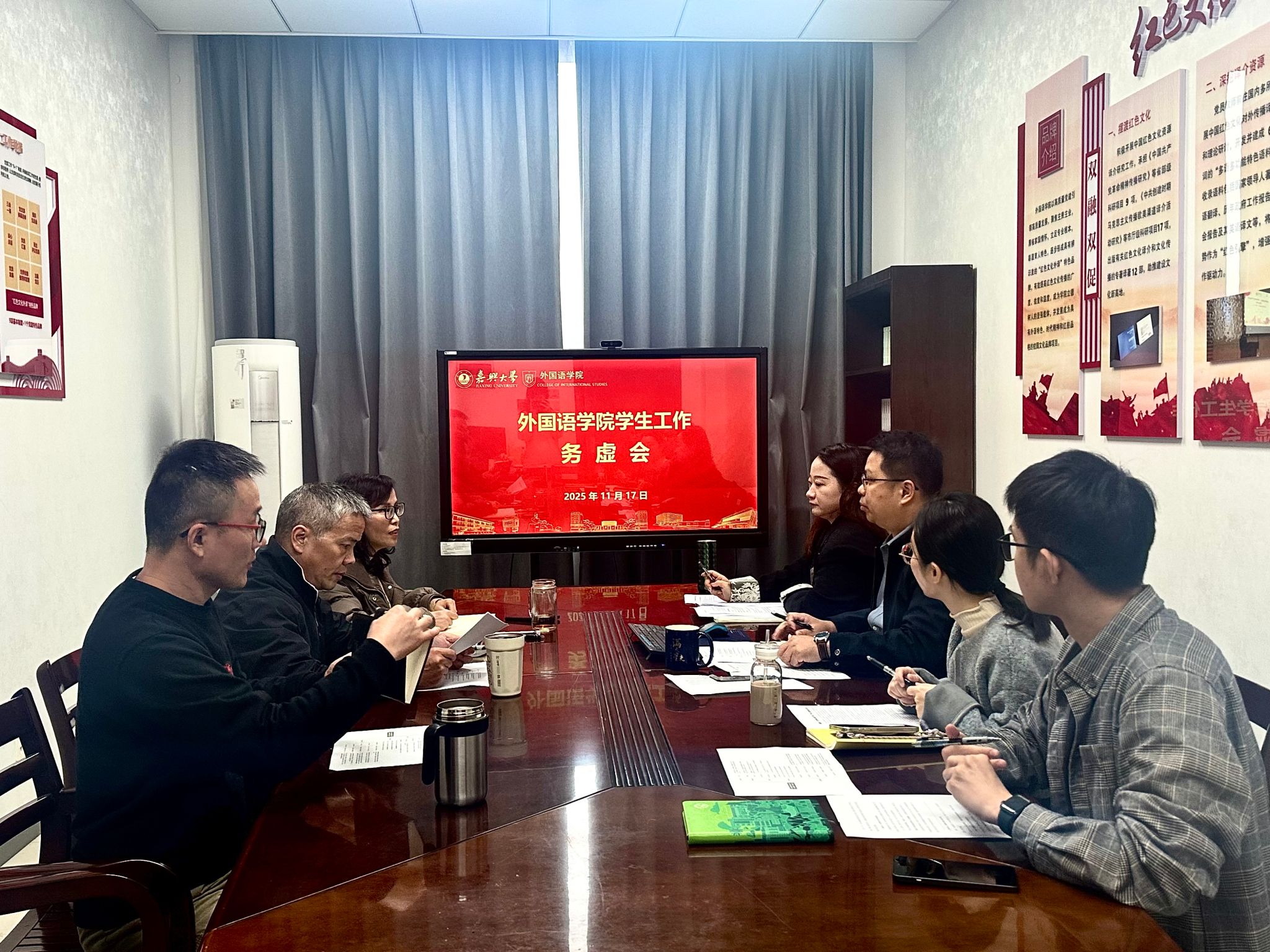 深入实施新时代立德树人工程,提升外国语学院学生思政教育质效,11月17日,外国语学院在兴德南楼521会议室召开学生工作务虚会,围绕“红译外院”思政育人体系的系统构建展开深入研讨。学院院长唐艳芳、党委书记刘巧芝、学术副院长单谊出席会议,全体辅导员参会。会议由学院党委副书记张啸峰主持。