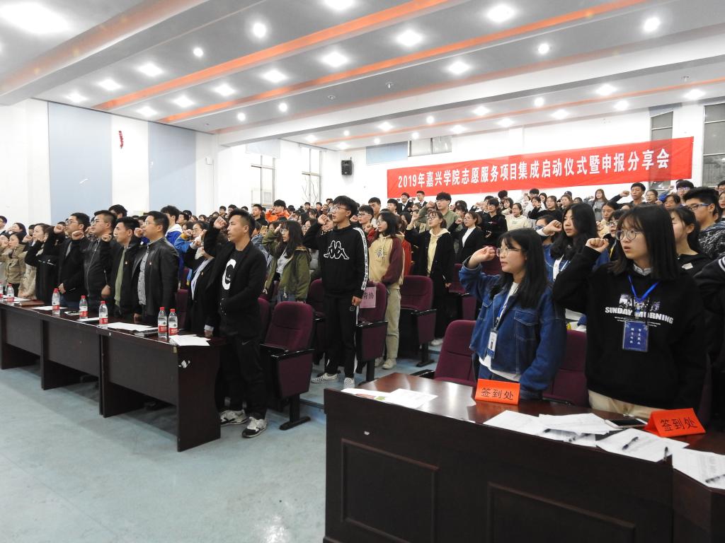 会议首先由校青协领读《嘉兴学院志愿服务项目集成倡议书》,然后是商学院团委和外国语学院团委进行经验分享。商学院“导医导诊” 志愿服务集成项目和外国语学院的“未来曙光”关爱特殊儿童群体志愿者服务集成项目是2018年首次获批的校第一批志愿服务集成项目。分享会上,商学院团委和外国语学院团委分别对项目集成过程、活动开展等方面的经验进行介绍,令参会代表们获益匪浅。其次是第二批志愿者服务集成项目进行申报,申报项目共有七项,分别是医学院的“青春守护者”和“爱在嘉兴,杏林送暖”、南湖学院的 “衔枝筑巢”、师范学院的“童心缘”、文法学院的“书香使者”及外国语学院的 “梧桐树”服务集成项目。最后,大会在全体宣读志愿誓词声中圆满落下帷幕。