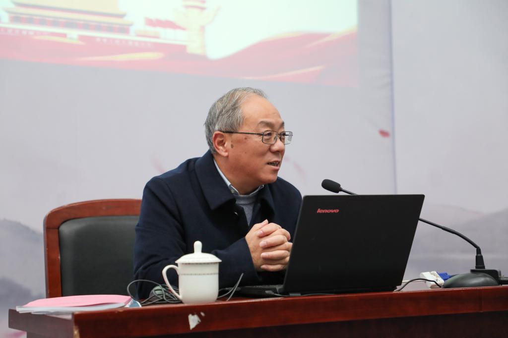为深入学习宣传贯彻党的十九届四中全会精神,进一步深化“不忘初心、牢记使命”主题教育,12月26日,校党委十九届四中全会宣讲团成员、副校长费建文为外国语学院和机电工程学院全体教职工作党的十九届四中全会精神宣讲报告。报告会由外国语学院党委书记陶丹玉主持。