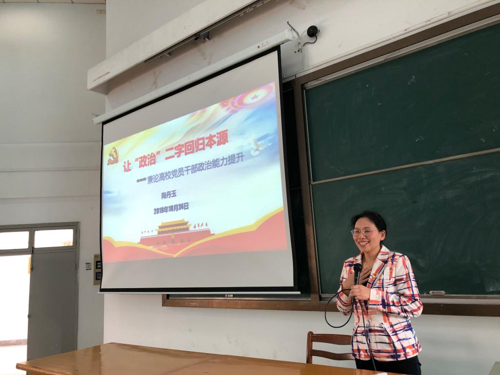 为扎实推进“不忘初心、牢记使命”主题教育,落实上级党委主题教育实施意见,10月24日下午在外语楼310会议室,外国语学院党委书记陶丹玉给全院师生党员上了一堂以“让‘政治’二字回归本源——兼论高校党员干部政治能力提升”为题的专题党课。全院师生党员到会听课。