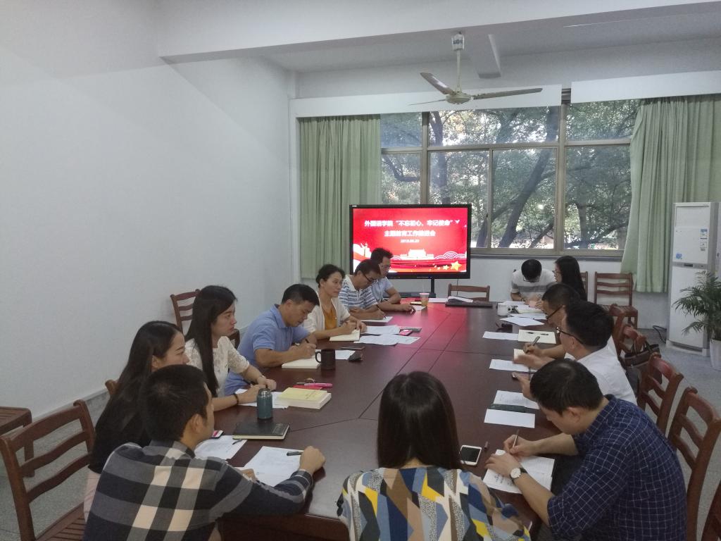 9月29日,外国语学院在外语楼204会议室召开“不忘初心、牢记使命”主题教育工作推进会,学院党政领导班子成员、学院“不忘初心、牢记使命”主题教育工作小组全体成员以及学院各党支部书记参加会议,会议由学院党委书记陶丹玉主持。
