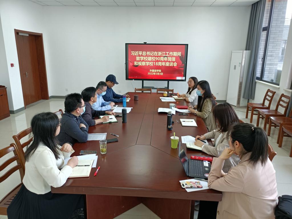 5月3日,外国语学院在兴德楼南楼516召开座谈会,专题学习贯彻习近平总书记在浙江工作期间致学校建校90周年贺信和视察学校18周年座谈会精神。学院党政领导班子成员、党委委员、各党支书记和教师代表参加座谈,会议由学院党委书记周钰主持。