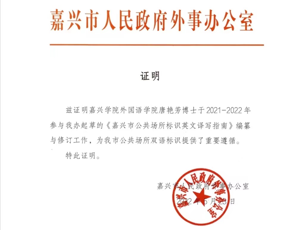 2021年7月,嘉兴学院推出“博士军团”服务地方专项行动,自学校“博士教师服务地方专项行动”实施一年来,外国语学院共有9名博士党员积极参与了十余项博士服务地方专项活动,博士教师们参与服务的热情较高。我院博士教师充分发挥外语优势,结合自身专业特长,紧紧围绕嘉兴改革发展大局,主动对接地方发展战略,用情、用心、用力深度服务嘉兴经济社会发展,取得良好成效,得到了地方政府部门和企事业单位的充分认可。外国语学院院长唐艳芳博士就是我院博士服务团中的优秀代表,唐艳芳博士通过参与嘉兴市人民政府外事办《嘉兴市公共场所标识英文译写指南》的编纂与修订工作,为嘉兴市进一步规范使用公共场所外语标识、避免出现不规范使用等问题提供了重要遵循。