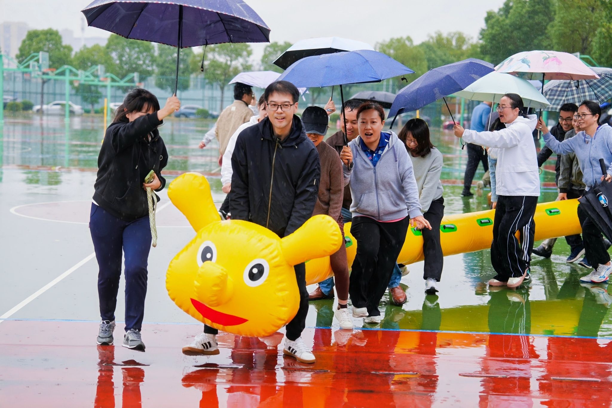 外国语学院的教师们不畏风雨,换上轻便运动装,卸下讲台前的沉稳,化身活力满满的运动达人,眼神中满是跃跃欲试的期待。本次趣味运动会设置了毛毛虫接力、巨人的脚步、八仙过海、爱的魔力转圈圈等多个兼具趣味性与协作性的项目。毛毛虫赛道上,老师们跨坐在充气“毛毛虫”道具上,齐声喊着“一二”口号,步伐整齐地同步挪动;巨人的脚步项目中,队员们套好绑腿带,在领队的统一指挥下,从最初的笨拙不协调逐渐变得流畅默契,携手冲向终点;八仙过海项目考验着大家的耐力与坚持,爱的魔力转圈圈则尽显巧思与灵活,选手们或敏捷穿梭或稳扎稳打,精彩表现引得场边喝彩声不断。
