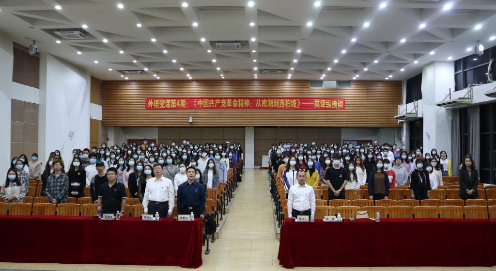 党课在全场齐唱雄壮的《国际歌》之后开讲。唐艳芳从话语和话语体系的概念切入,围绕《中国共产党革命精神:从南湖到西柏坡》的英译实践,带领同学们深入探讨了党史文献和红色文化英译过程中话语转换的意义、问题和方法。他指出,做好党史文献英译的话语转换,一要提高认识、转变观念;二要立足中国、增强自信;三要积极探索、提高效率。最后,他勉励同学们作为新时代大学生要坚定“四个自信”,增强“四个意识”,做到“两个维护”,用外语讲好中国红色故事。
