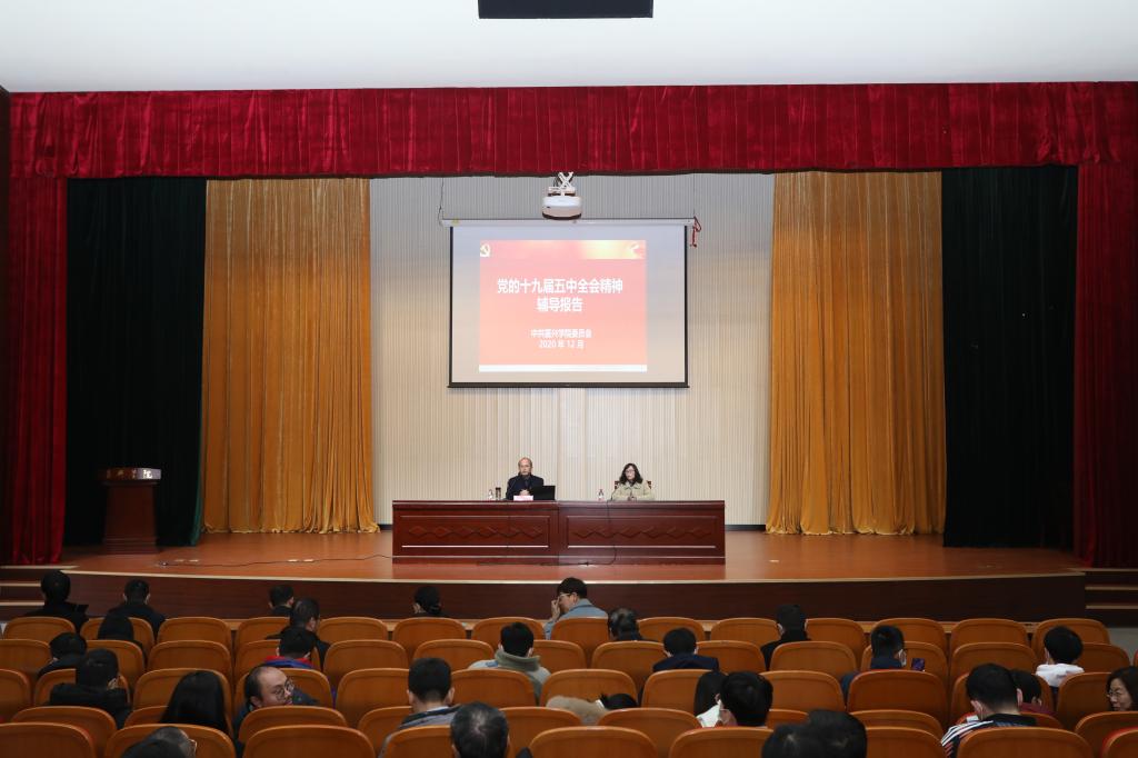 12月17日下午,外国语学院、建工学院、设计学院在越秀校区教二报告厅集中召开党的十九届五中全会精神宣讲活动。本次活动由杨培强副校长作党的十九届五中全会精神辅导报告,校党委宣传部刘巧芝副部长主持,三个学院全体教职工及部分党员学生代表参加集中学习。