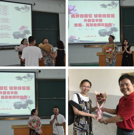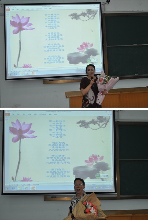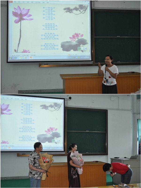 欢送会由外国语学院院长唐艳芳主持。伴随着歌曲《长大后我就成了你》和《老师你好》深情、优美的旋律,大会开始了。首先杨雪梅、孙彦武两位老师分别向刘少萍、徐红敬献鲜花并回忆了与他们共事的点滴感人细节。接着在一曲悠扬的古筝曲《出水莲》伴奏下,张静老师声情并茂地朗诵了唐艳芳院长有感而发新作的诗《有一种缘分》。随后,唐艳芳院长致“欢送词”,代表外国语学院向三位老师致敬,并向两位退休老师数十年如一日的辛勤劳动和付出表达感谢和祝福,向攻读博士的顾敏老师表达欢送和几年之后“收鹤”的愿望。