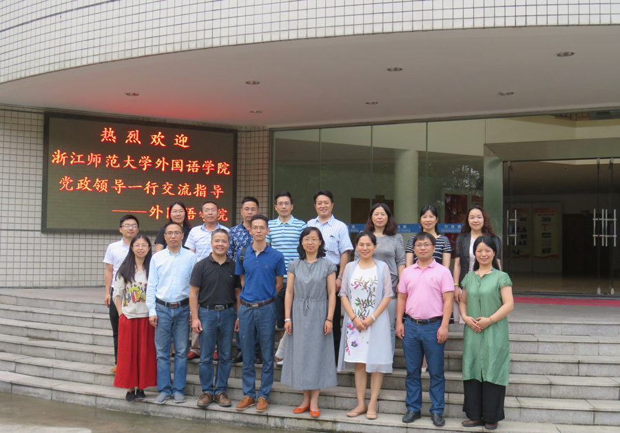 2017年6月26-27日,浙江师范大学外国语学院党委书记俞明祥、院长洪明、党委副书记林凌斌、副院长胡美馨、日语系主任徐微洁、翻译系主任李建军、大外部主任骆巧丽、教务办主任颜文钦、院办主任郑基一行9人来我院考察交流。