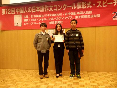 2016年 12月12日,由日本侨报社•中日交流研究所主办的“第12届中国人日语作文大赛颁奖仪式”在北京日本驻中国大使馆举行。我校外国语学院日语专业李琳玲和朱杭珈两位同学分获三等奖,张媛媛和严晨曦两位同学分获佳作奖,日语系畅宝仁和小林新两位老师获“优秀指导教师奖”,乐鱼官方端网站登录入口日语系被授予了“园丁奖”。