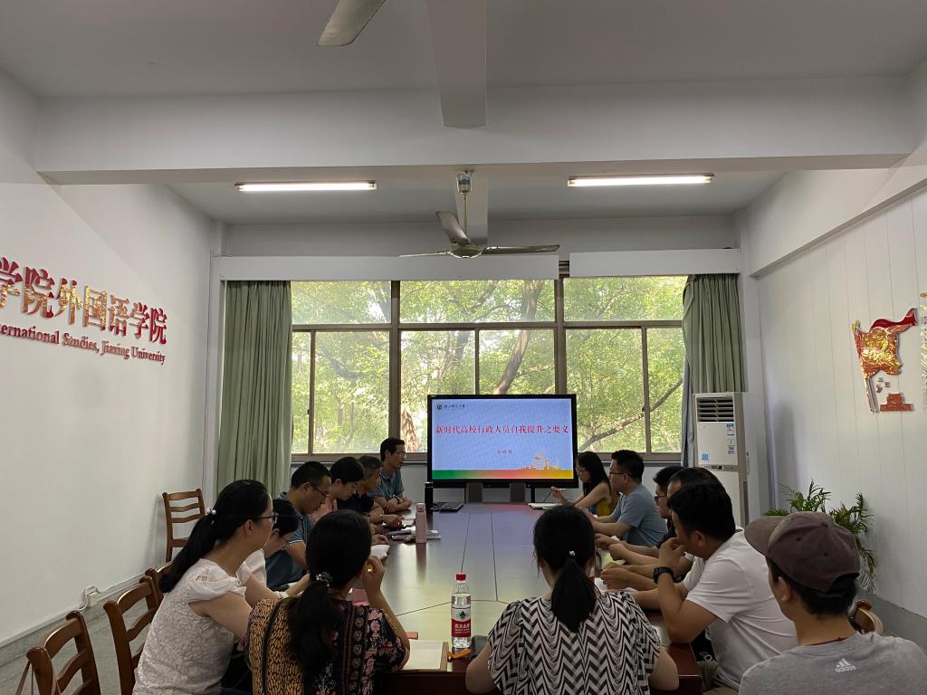 为推进党史学习教育,培育优良师德师风,提高行政管理水平,做到学党史、悟思想、办实事、开新局,7月12日下午,外国语学院特别邀请浙江师范大学外国语学院党委书记俞明祥作题为“新时代高校行政人员自我提升之要义”的专题讲座,讲座由外国语学院院长唐艳芳主持,学院领导班子成员、行政人员、系部主任及支部书记参加讲座。